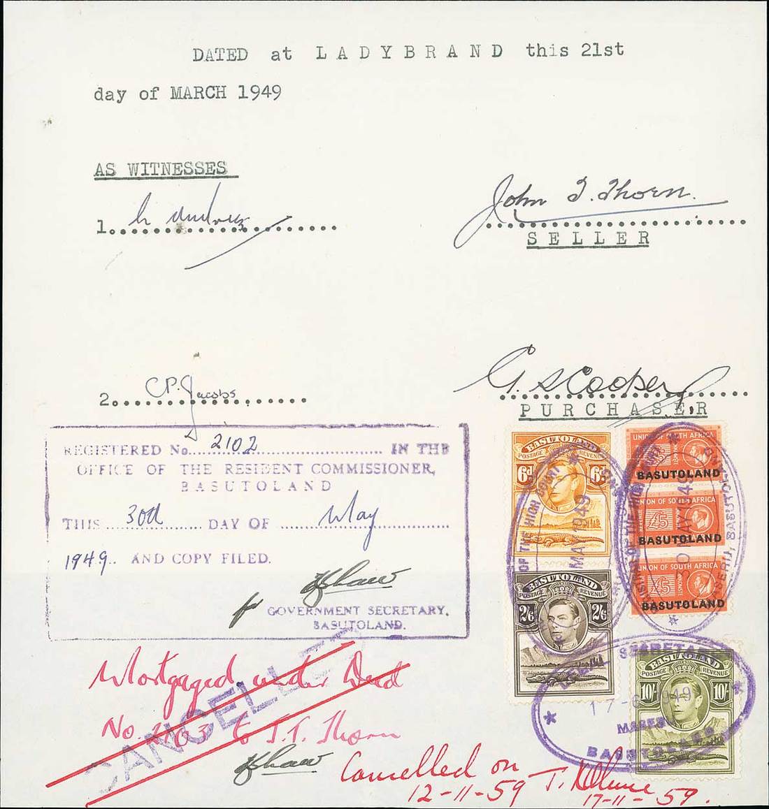 1949 (30 May) Deed of Sale back page bearing 1943 Series 31 £5 bright orange "Bantams" (3), including one complete unit, and 1938 Postage/Revenue 6d., 2/6d., and 10/-, cancelled by "registrar of the high court/ maseru basutoland" crisp oval datestamps, the 10/- added on 17th June with a "legal secretary" oval cancellation. Filing fold runs discretely through one £5 value, otherwise fine. Photo