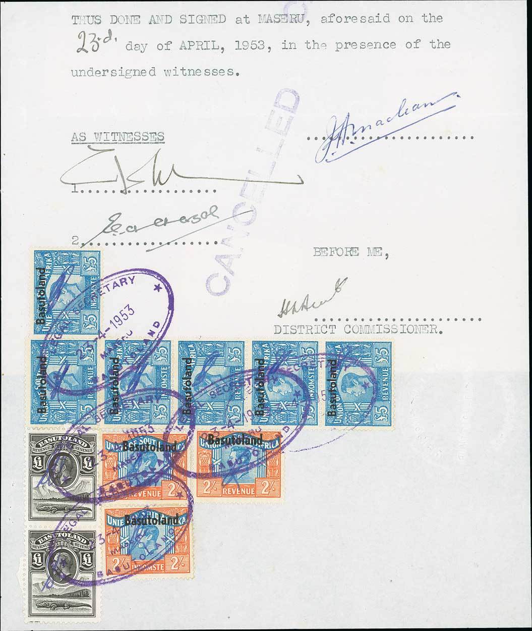 1953 (23. April) Mortgage Bond bearing 1950 Series 35 £5 light blue, (6) including bi-lingual vertical strip of five, Series 34 2/- (3), and 1933 £1 black (2) for a total franking of £32/6/-, offered with Series 34 2/- horizontal pair on document page (rare thus), with embossed cancellation, and two singles on pieces. A fine group, the £5 document most appealing. Photo