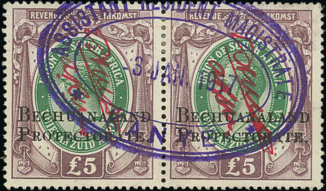 1914-30 collection (10) of overprints comprising 1914 "bechuanaland/protectorate." on South Africa 6d., 2/6d. (pair, on piece), 10/- (3, a pair and single all on same piece) and £5 (horizontal pair), with 1932 "Bechuanaland/ Revenue Only." 2/- and £1, all fine used in condition far above average. Photo.