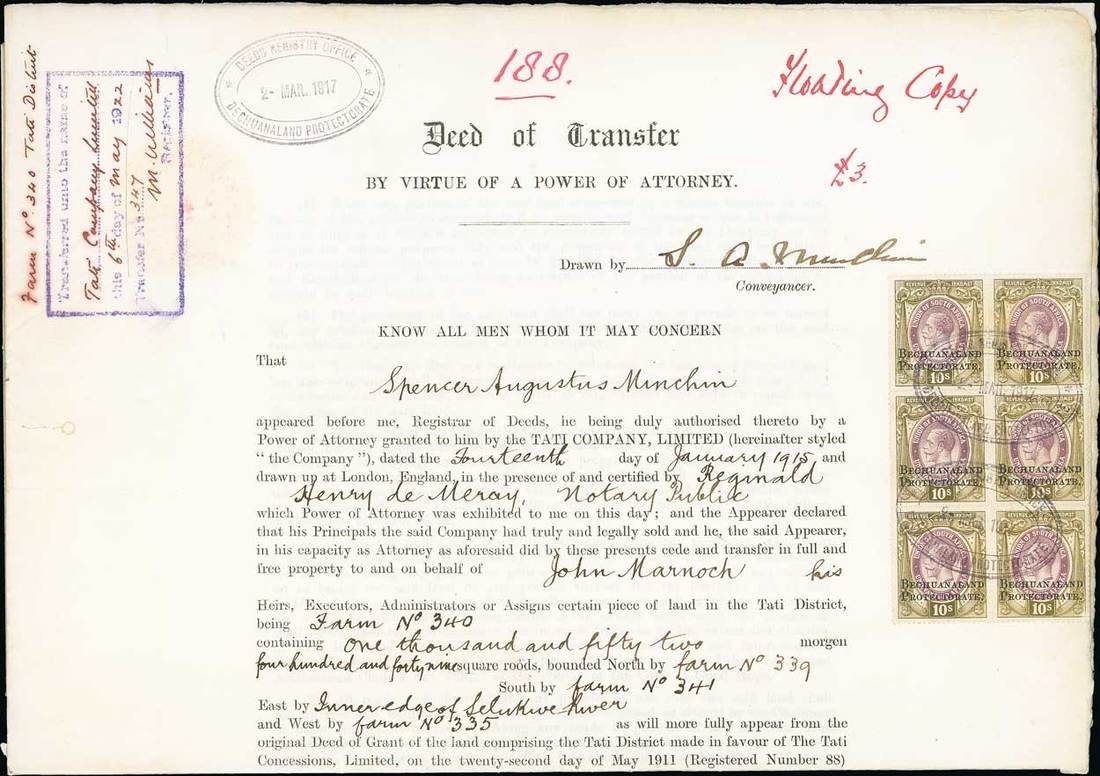 1917 (2 March) complete large format Deed of transfer bearing 1914 "bechuanaland/ protectorate" 10/- purple and green block of six (2x3), cancelled with "deeds registry office/ Bechuanaland Protectorate" oval h.d. dated "23 Mar. 1917" the additional page showing a hand painted map of the farm referred to owned by "The Tati company Ltd." with a £1 South Africa revenue issue applied in Capetown. Insignificant filing fold runs through two stamps; nevertheless a spectacular and very rare document. Photo