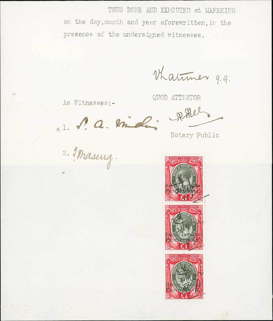 1922 Document page bearing 1914 £1 green and red overprinted "bechuanaland/ protectorate." vertical strip of three tied by colourless embossed cachet and manuscript initials. Fine and rare, very attractive usage which has preserved original colours. Photo