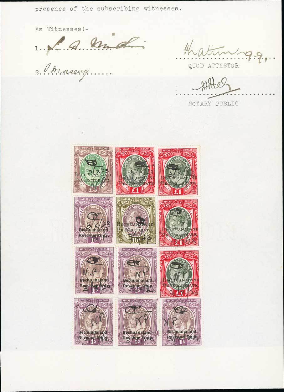 1923 (3 Oct.) Document page bearing 1914 "bechuanaland/protectorate." on South Africa revenues 10/-, £1 green and red (4), and £5 green and purple, with 1922 "Bechuanaland/ Revenue Only." (wide spacing) 1/- violet and purple (6), each cancelled with initials and "3/x/23" in manuscript, with some stamps also tied by a colourless embossed Notary seal. A spectacular and colourful franking showing a most unusual combination of values and types. Photo