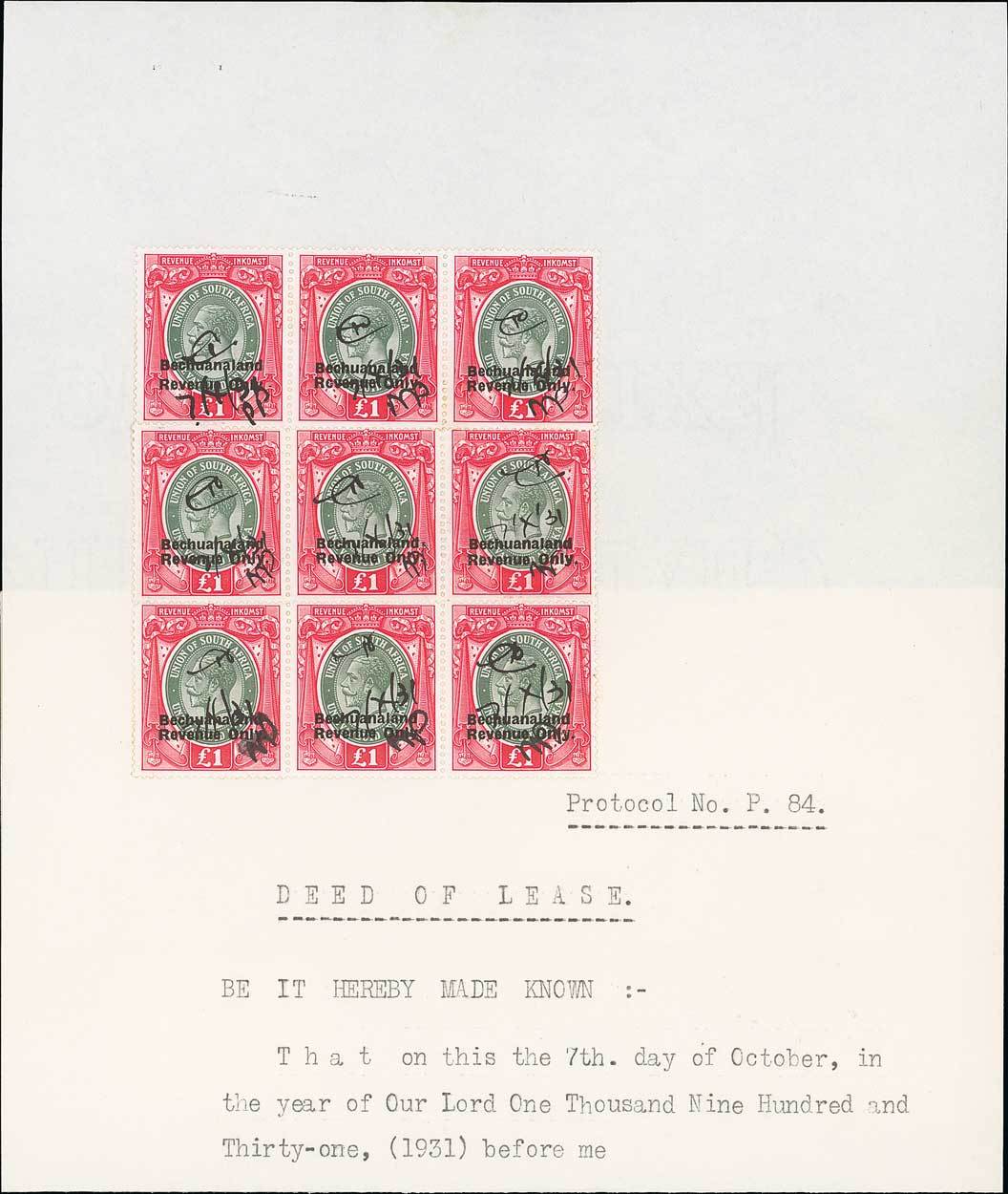 1931 (7 Oct.) Deed of lease page bearing South Africa £1 green and red (9) comprising three horizontal strips of three, the top strip showing both wide and narrow spacing se-tenant, each cancelled by initials and date. Beautiful quality with fresh original colours, and the only recorded example of this variety which has the potential to prove that the wide and narrow spacings (previously thought to have been issued some years apart) actually appeared on the same sheets. Photo