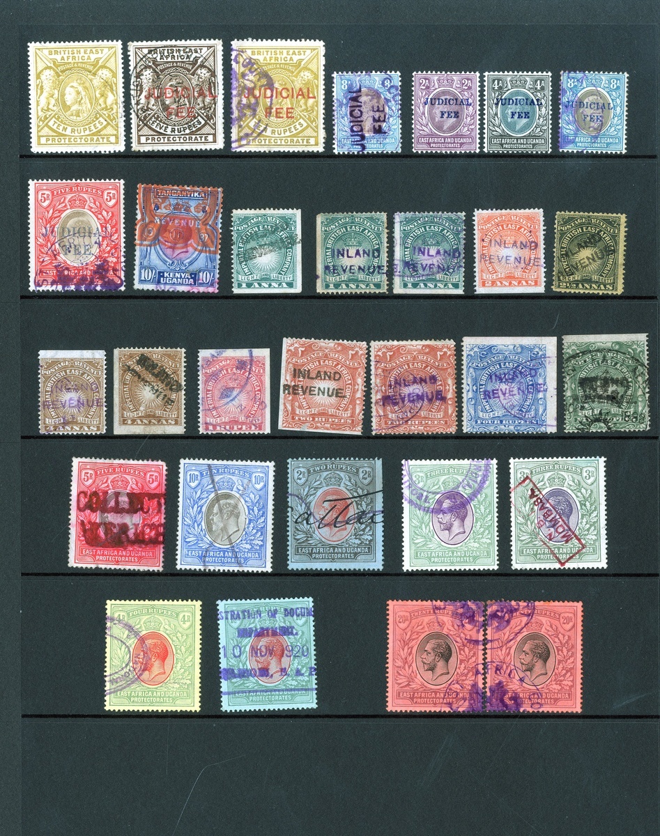 Selection (30) on stock sheet including British East Africa Judicial fee 1897 5r. and 10r., 1905 handstamped horizontally 8a. blue and grey, 1905 seriffed capitals 2a. and 4a. mint, 8a. and 5r. fine used, 1891 handstamped "inland revenue" issued (12) values from 1a. to 5r., showing both violet and black overprints, and a selection of East Africa and Uganda 1903-12 postage and revenue types (9) with values to 20r. (2). A fine lot, the judicial issues very scarce.