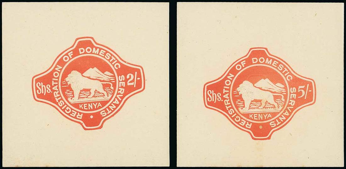c.1933 proof impressions in red, with blank date plugs (4) comprising 2/- and 5/- "registration of domestic servants" and 50c. and 1/50c. "kenya revenue", and extremely rare group ex- De La Rue archives, only the 50c. has a record of usage. Fine and most attractive. Photo