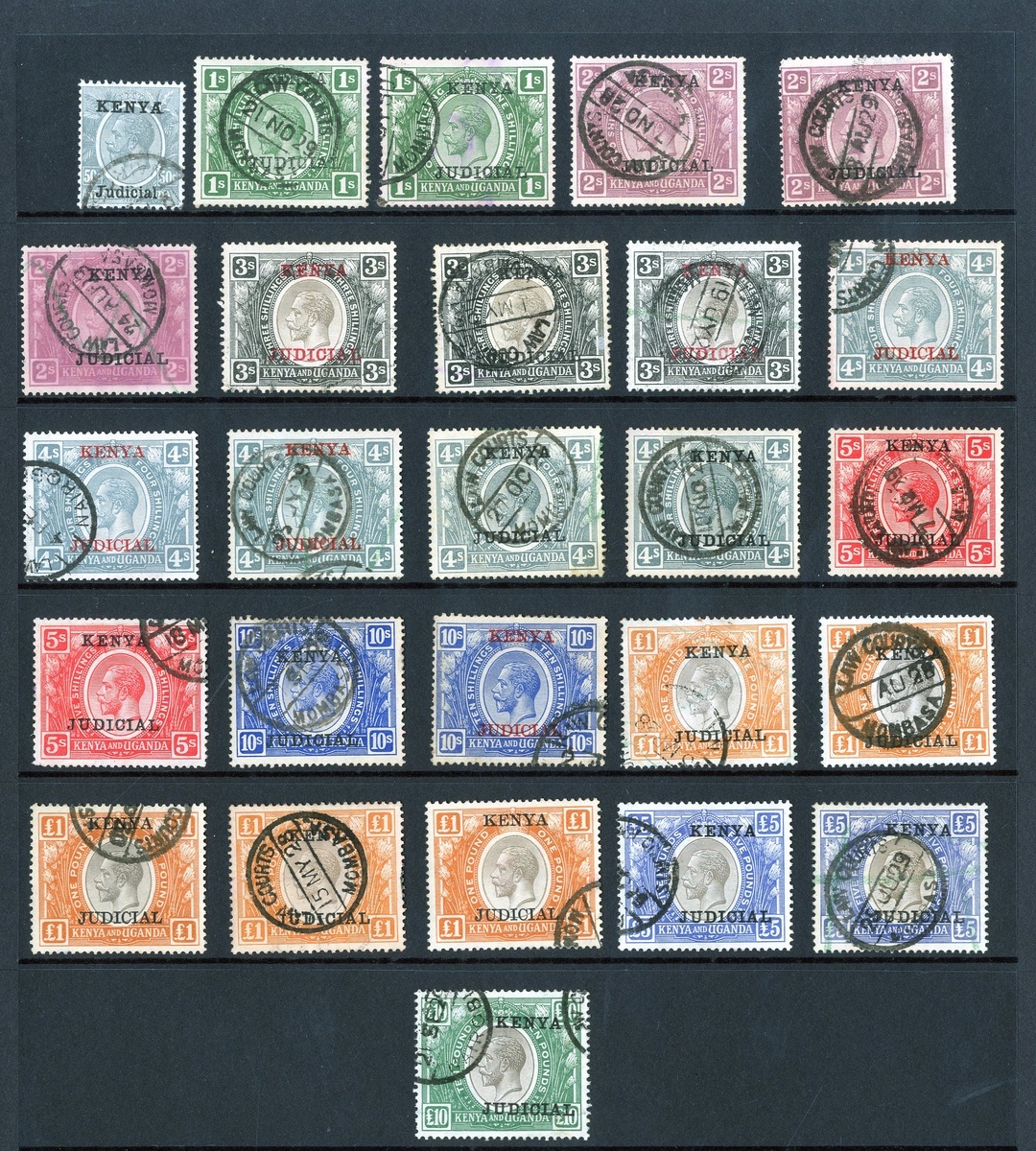 1922-28 50c. 1/- (2), 2/- (3), 3/- (4), 4/- (4), 5/- (2), 10/- (2), £1 (5), £5 (2), and £10 each overprinted "kenya/ judicial", predominantly fine used showing both London and local overprint types.