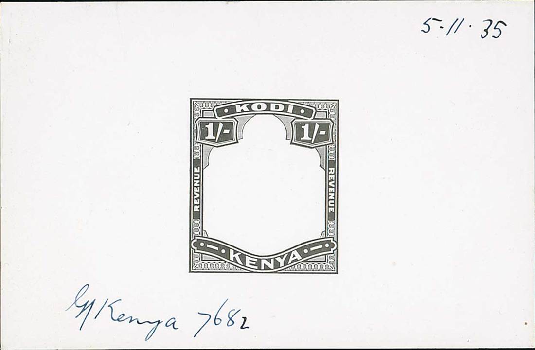 1935 Die Proof 1/- with blank vignette in black on glazed card (92x60mm.), dated "5.11.35", marked "G/Kenya 7682" fine. Photo