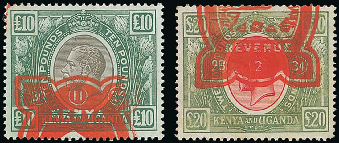1922-27 £10 black and green and £20 red and green, each cancelled by part "kenya/ revenue" embossed d.s. in red, minor surface rubbing to foot of £20 though an attractive and scarce pair. Photo