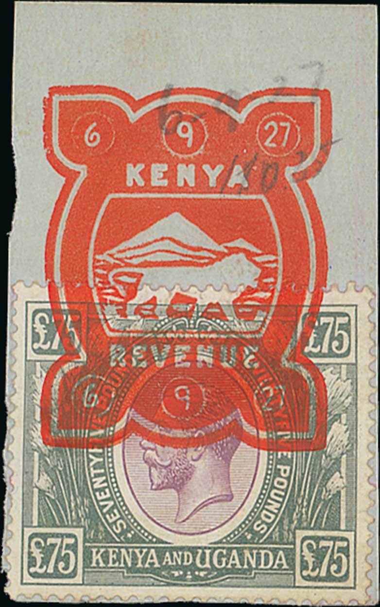 1922-27 £75 purple and grey, tied to piece by "kenya/ revenue" embossed datestamp in red (6.9.27), attractive and very rare, with less than ten examples recorded. Photo