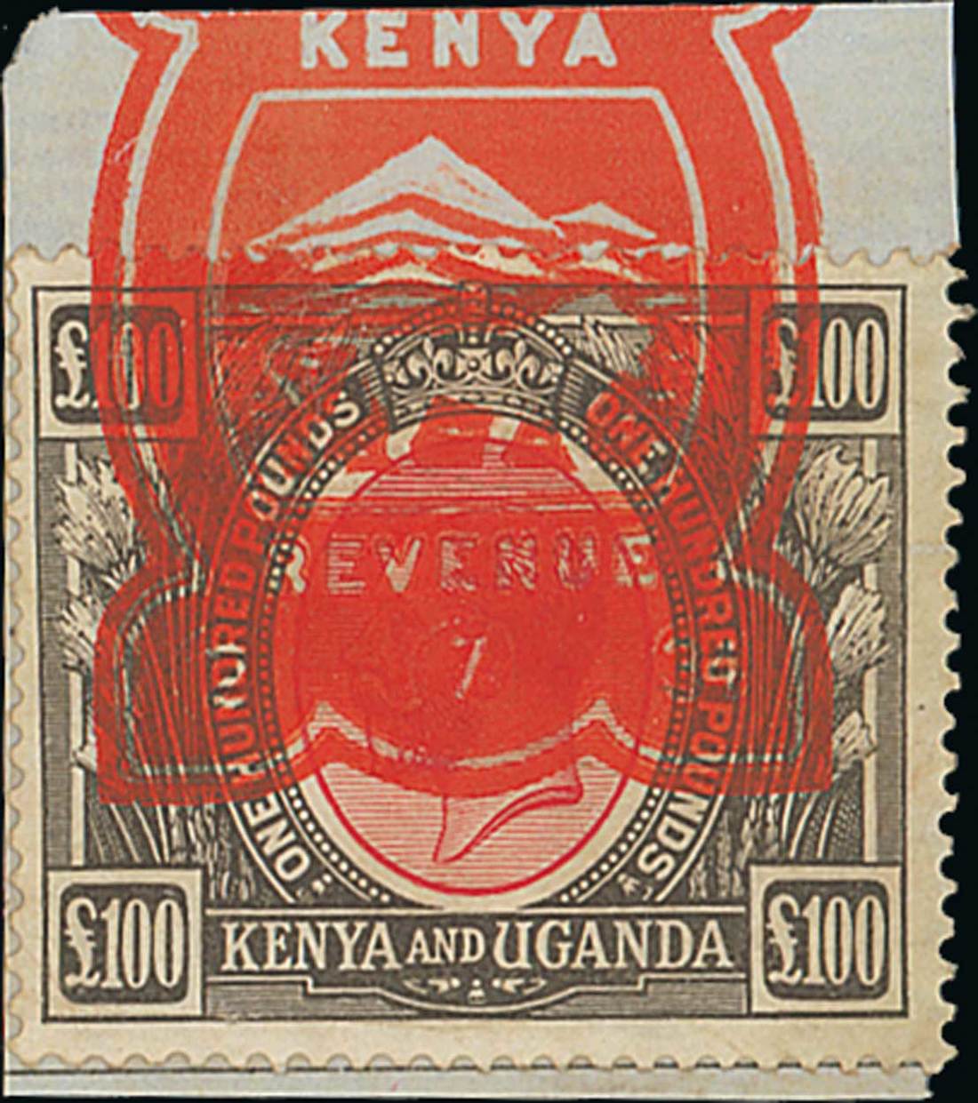 1922-27 £100 red and black, tied to small piece by "kenya/ revenue" red embossed datestamp (2.7.34), fine. Photo