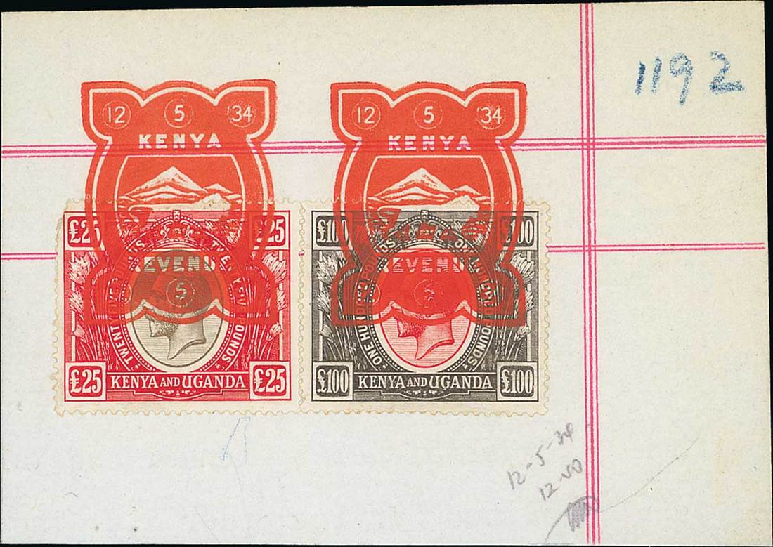 1922-27 £25 black and red and £100 red and black, each tied to document corner piece by red impressed cancel dated 12.5.34. Upper left corner of £25 with trivial short perfs though an extremely rare and visually attractive franking. Photo