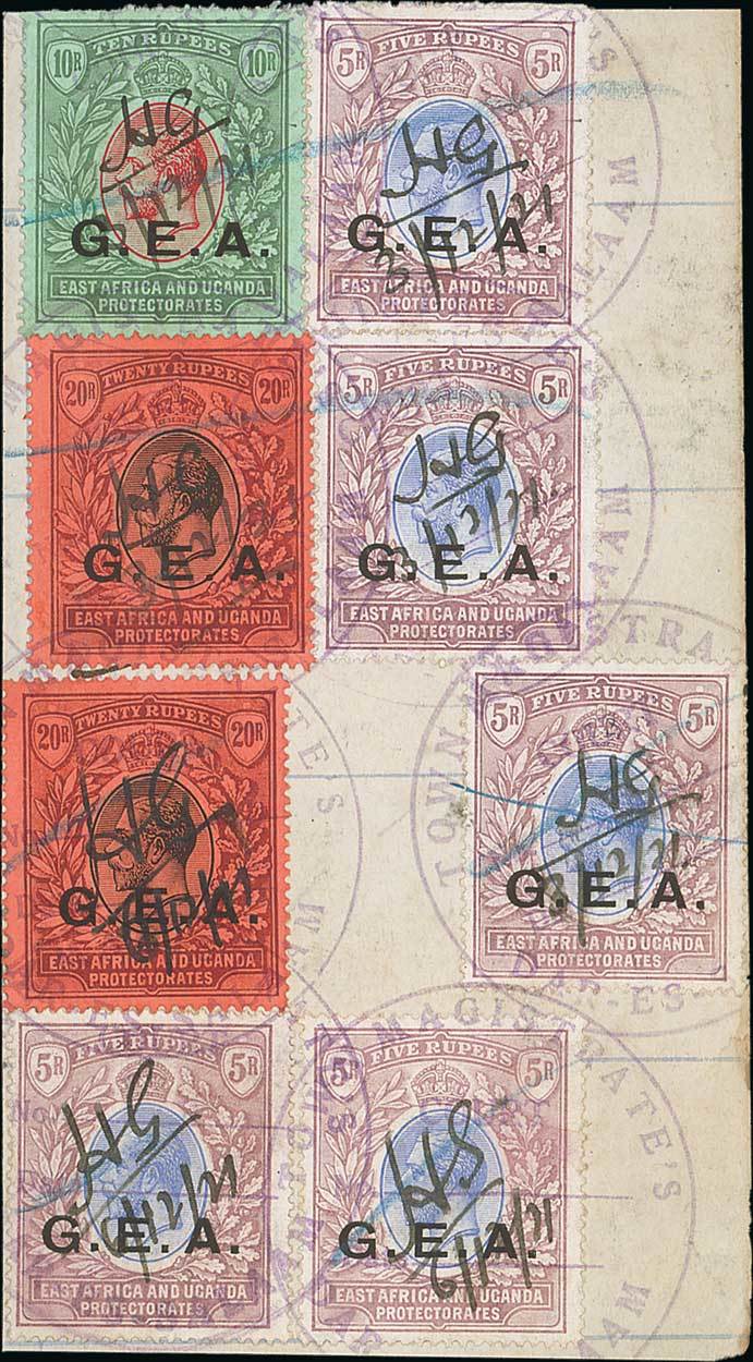 1917-21 G.E.A. overprints, 1c., 12c. pair, 2r. and 3r. on piece (1c. with two small punch holes), and 5r. (5), 10r. and 20r. (2) on piece, and 5r. blue and dull purple, fourteen examples on piece, all crossed by blue crayon and with manuscript initials and date, and tied by large "town magistrate's/court/dar-es-salaam" circular handstamp in violet, fine and scarce usage. Photo