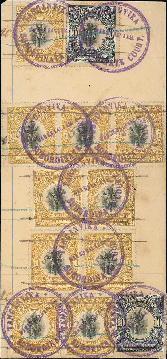 1926 (June) piece bearing 10s. (2) and £1 (10; all a little discoloured), "Giraffes", all crossed by green crayon and tied by "tanganyika/dar es salaam/subordinate court" circular cachet in violet; two with tiny worm-hole otherwise fine, offered with 1927 (May) piece bearing 50c., 2/-, 5/- and £1 (2), keyplates, each with manuscript date, crossed by green crayon and tied by "tanganyika/dar es salaam/subordinate court" circular cachet in violet; and 1930 (Feb.) piece bearing £1 (5), each with manuscript initials, crossed by green crayon and tied by large "resident magistrate/dar es salaam" oval d.s. in violet; fine