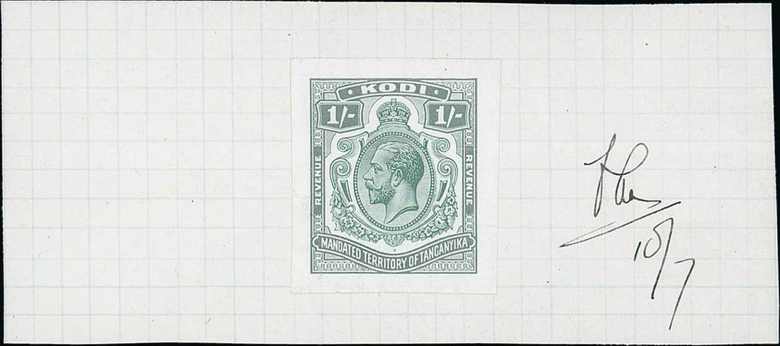 1935 1/- imperforate colour trial in green and dark green, affixed to piece of Appendix sheet, initialled and dated "10/7", crease through sheet runs through stamp, not affecting fine and attractive appearance. Photo