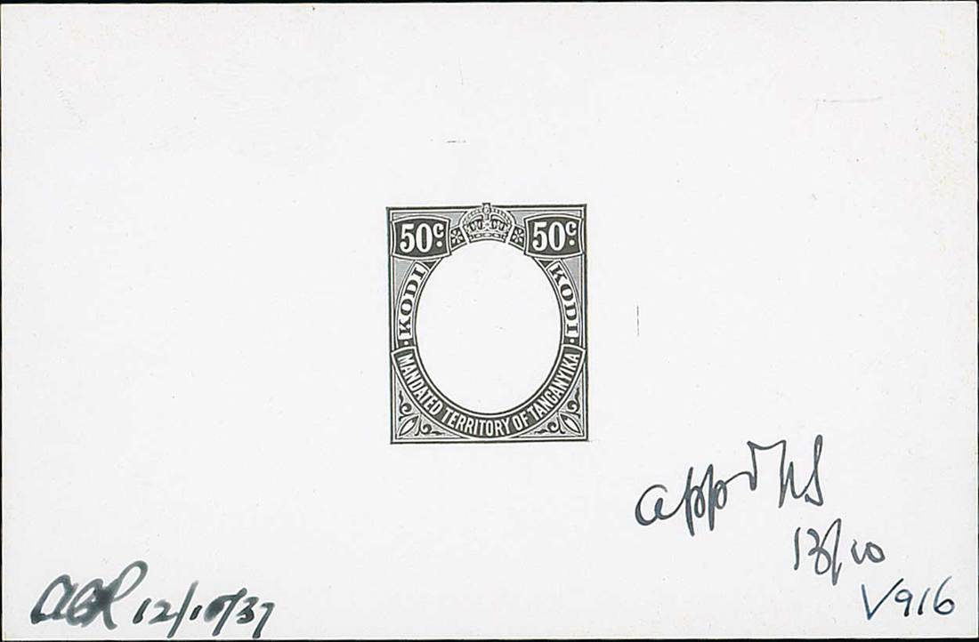 1937 50c. Die proof in black on glazed card (92x60mm) with blank vignette, of small format unadopted design initialled and dated "12/10/37" further marked "Appd" initialled and dated "13/10". Fine. Photo