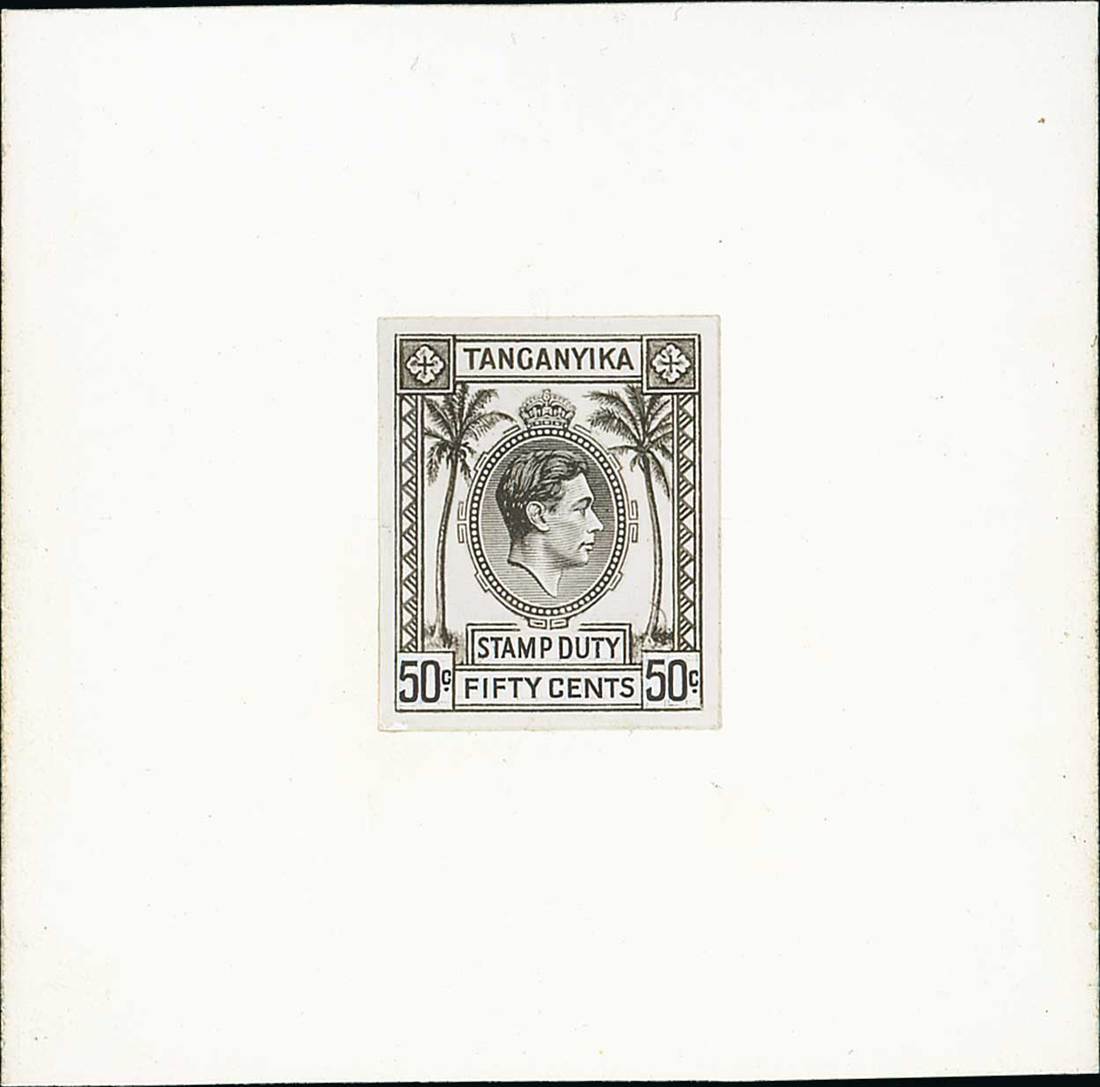 c.1938 50c. and 20/- composite photographic essays with "stamp duty" and value tablets handpainted in black and highlighted with Chinese white, and frame and vignette in black as issued, each mounted on card (40x40mm). Attractive and rare proofs from a late stage of the design process. Photo