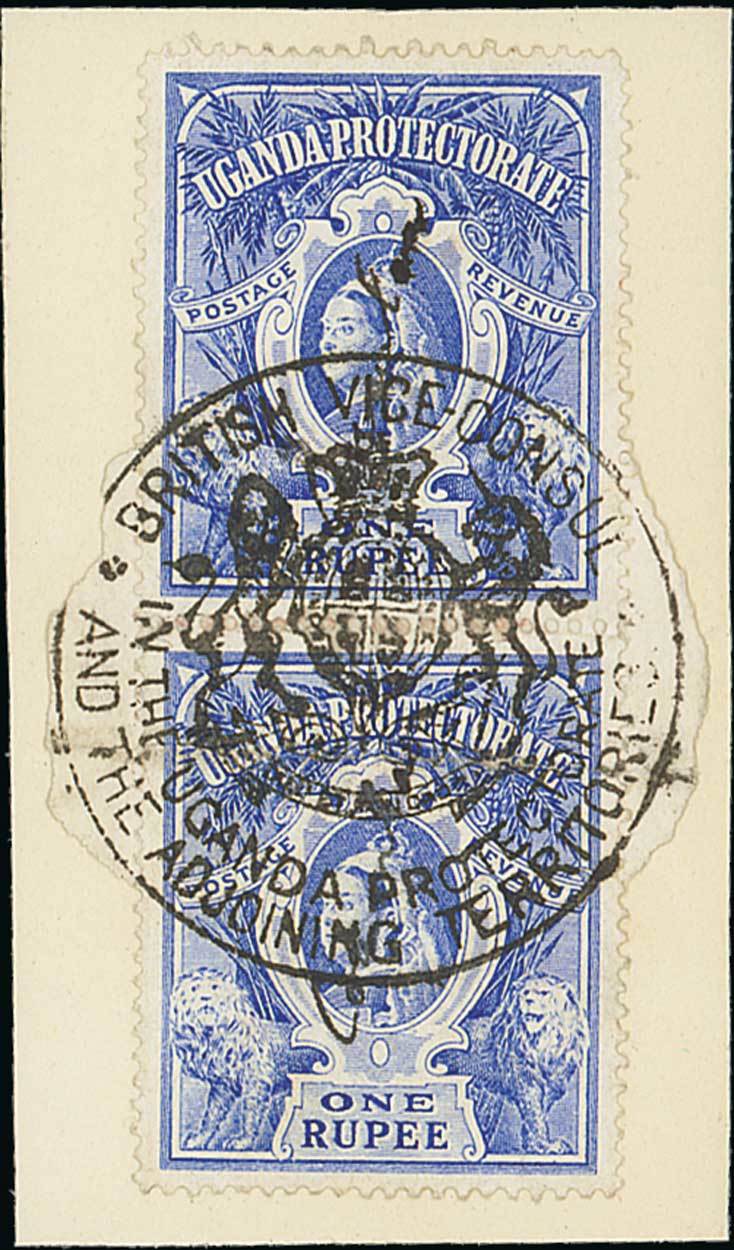 1898-1922 collection (68) on pages featuring Uganda consular 1r. ultramarine used pair on piece with complete Vice-Consul h.s., 1898 Revenue values to 5r., 1905-07 KEVII values to 50r., KGV Revenue issues to £1, including 1933 "Motor Driver's Licence" 5/- red with overprint at top, Impressed revenue archive proof impression of 10r. blue crossed out and annotated "shillings" in manuscript, with cut outs of 20c., 50c., 1/- (2), 2/- 3- values in blue (the shilling values scarce). An interesting selection containing many rarely seen issues.