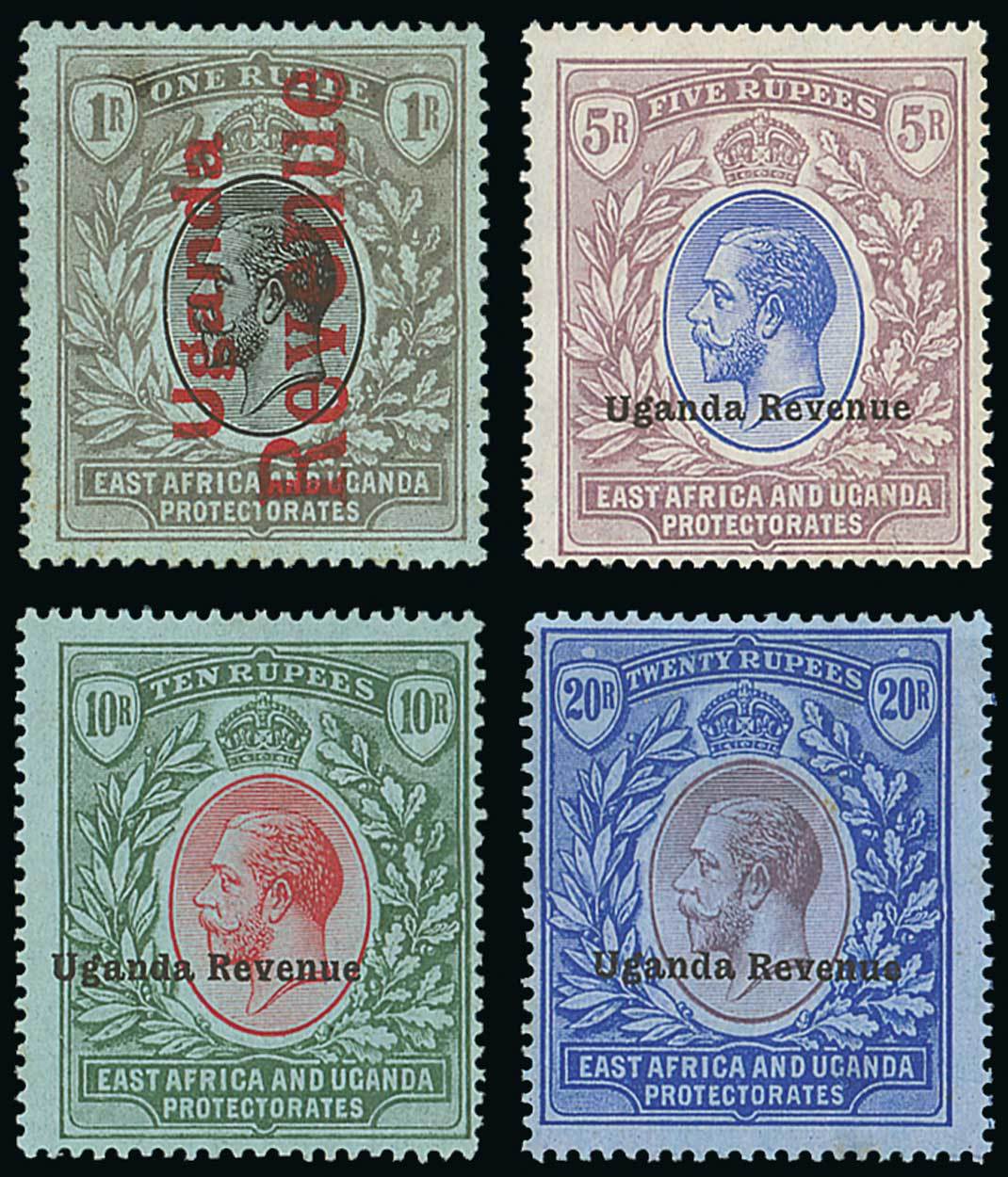 1912-18 mint collection (12) of 'Uganda Revenue' overprints comprising 1912 1c., 10c., 75c., and 2r., 3r., 4r., 5r., 10r. green and red on green, and 20r. blue and purple on blue, 1918 vertical overprint 6c., 50c., and 1r. Odd values with tone spots invisible from face though a fine and attractive group. Photo for 10r., 20r.