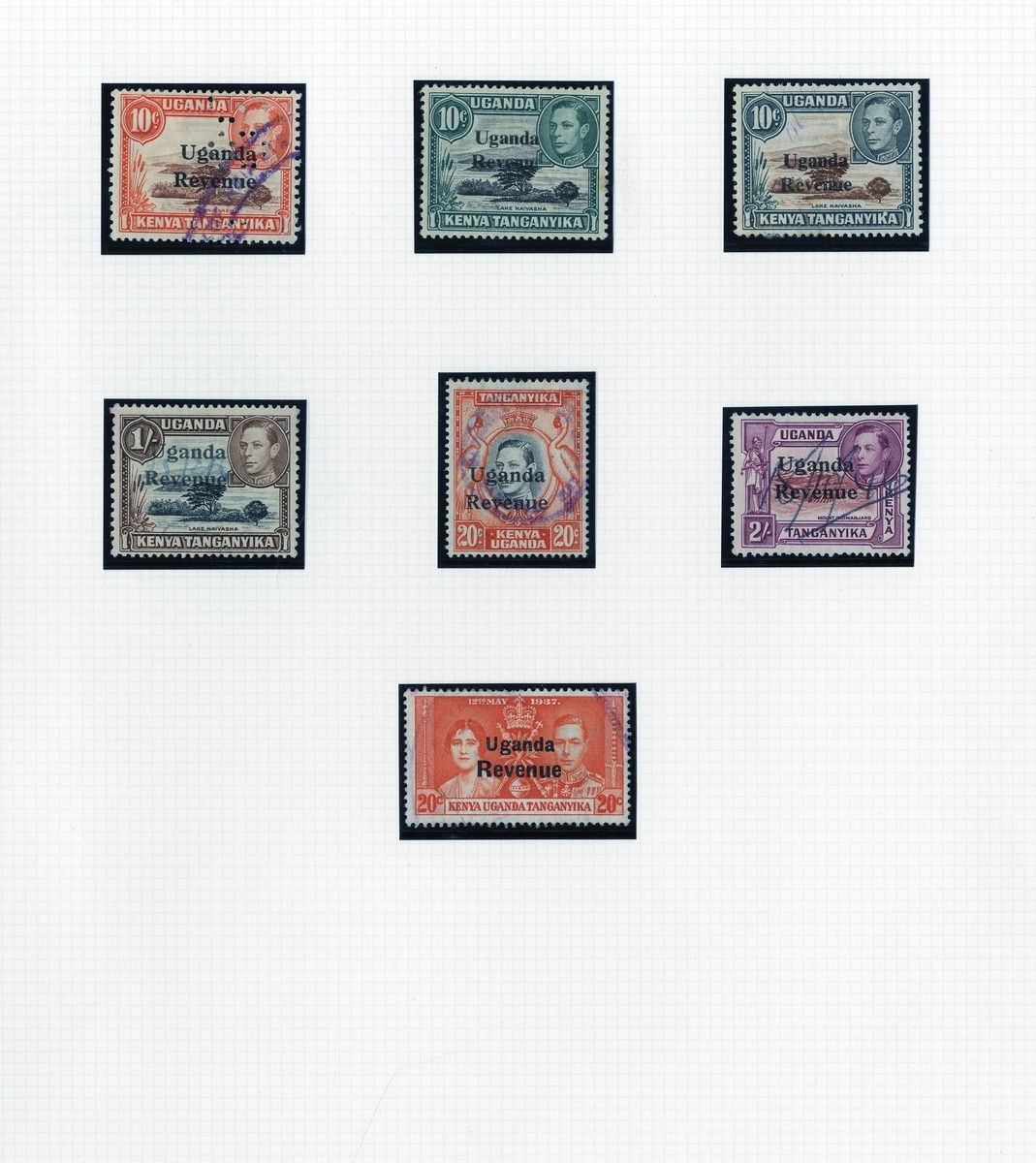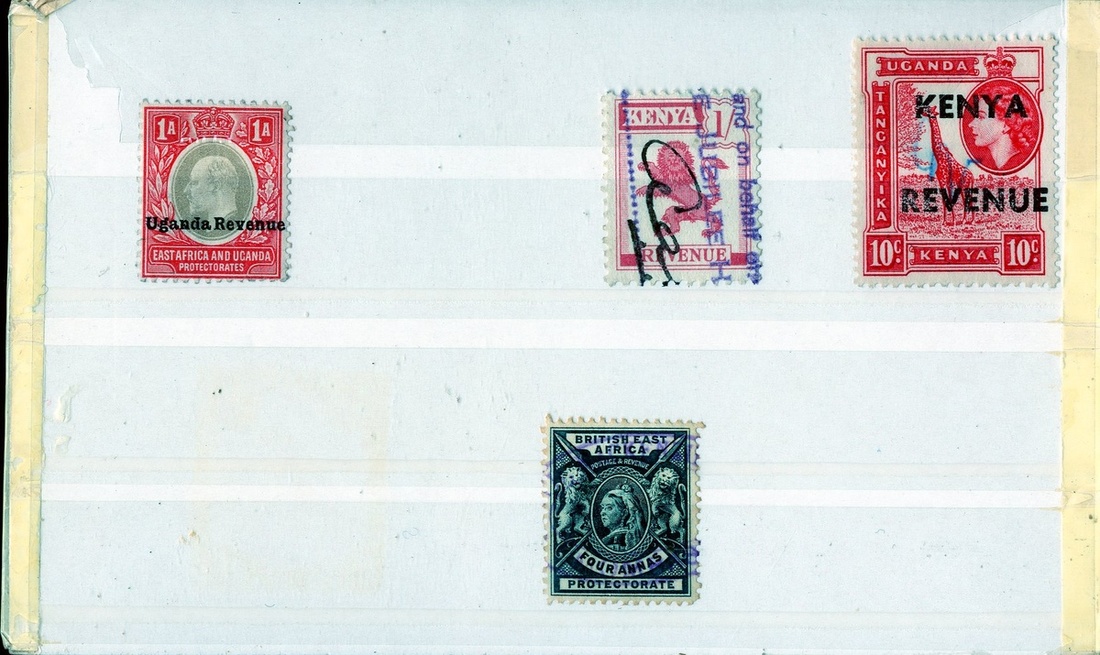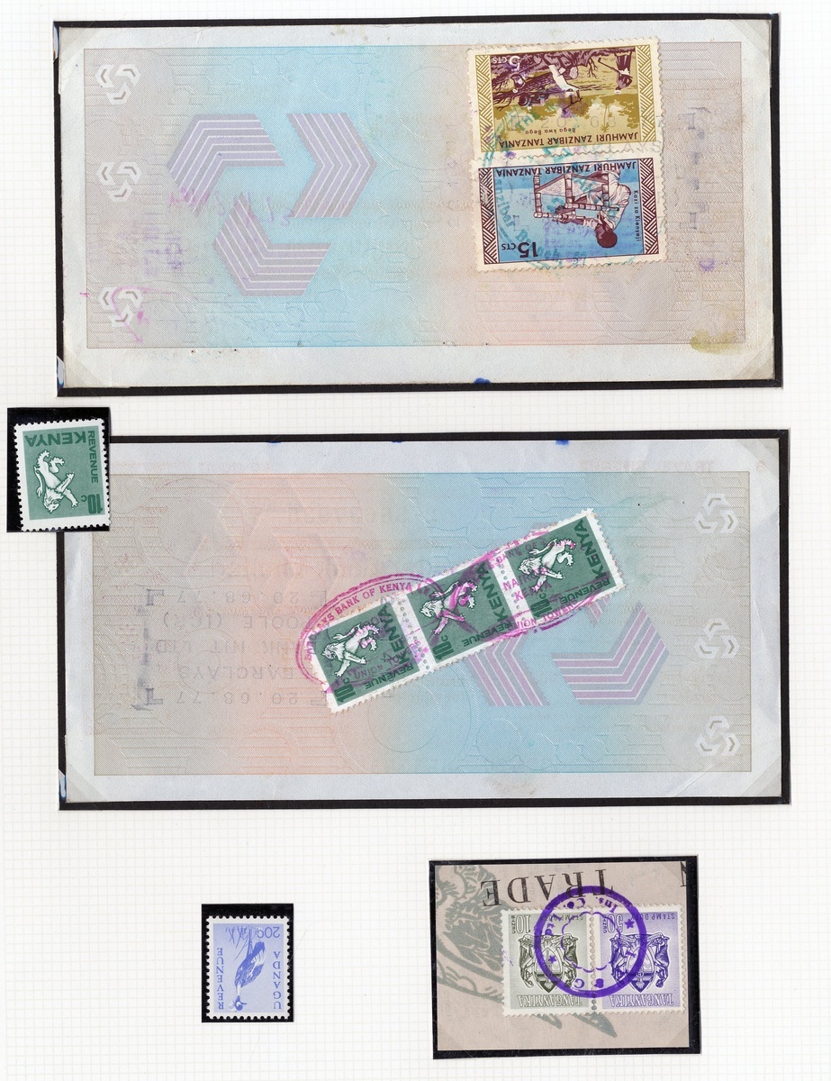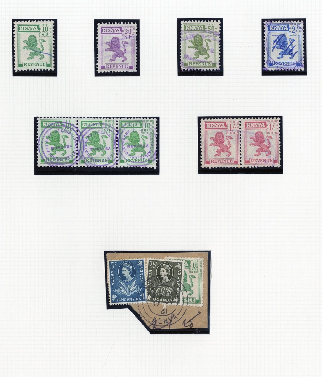 Balance collection on pages and cards with much of interest including Uganda Revenue 1935 10c. black and yellow (5) tied to airmail cover to London, and single values to 5/-, KGVI values to 5/-, QEII to £1, Kenya Revenue 1954 10c. red and 20c. orange and black in marginal blocks of four, and single values to 5/-, Graduated personal tax remainders, opt. "msa/ 02" including imprint blocks of four, Tanganyika including KGVI set to 20/-, with QEII and KGVI 10c. multiples including plate blocks, current number singles and multiples and Kenya impressed revenue 4/- red on complete document. An interesting lot.