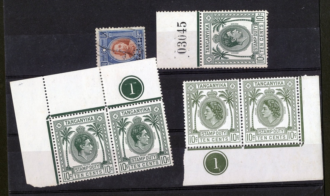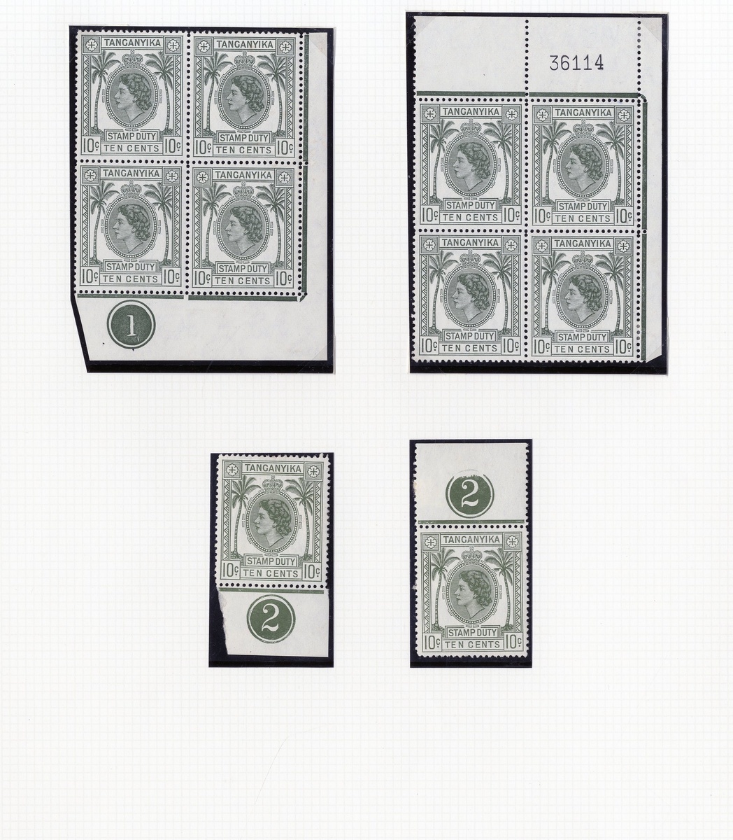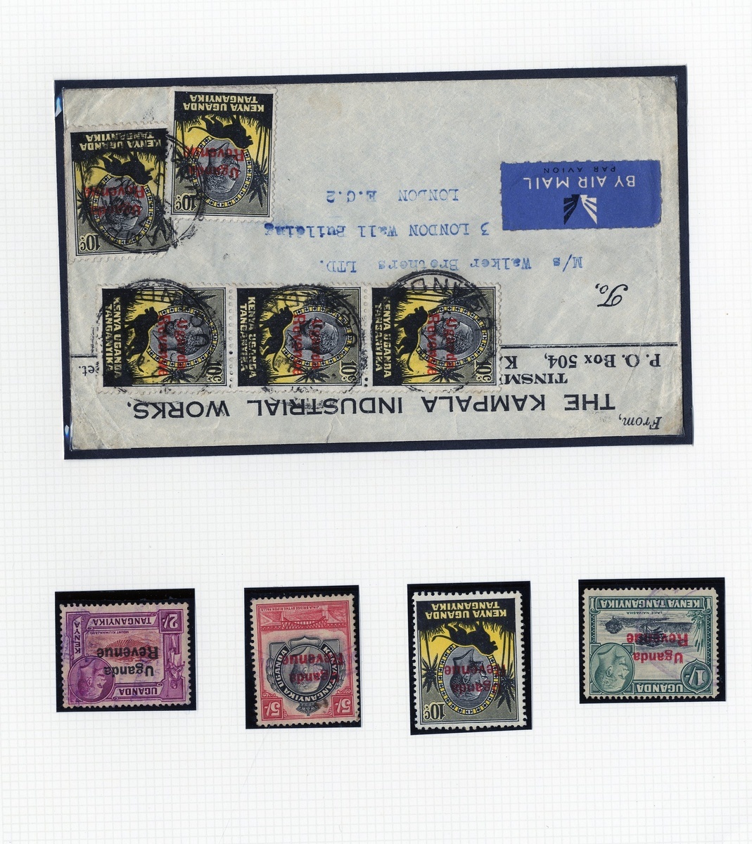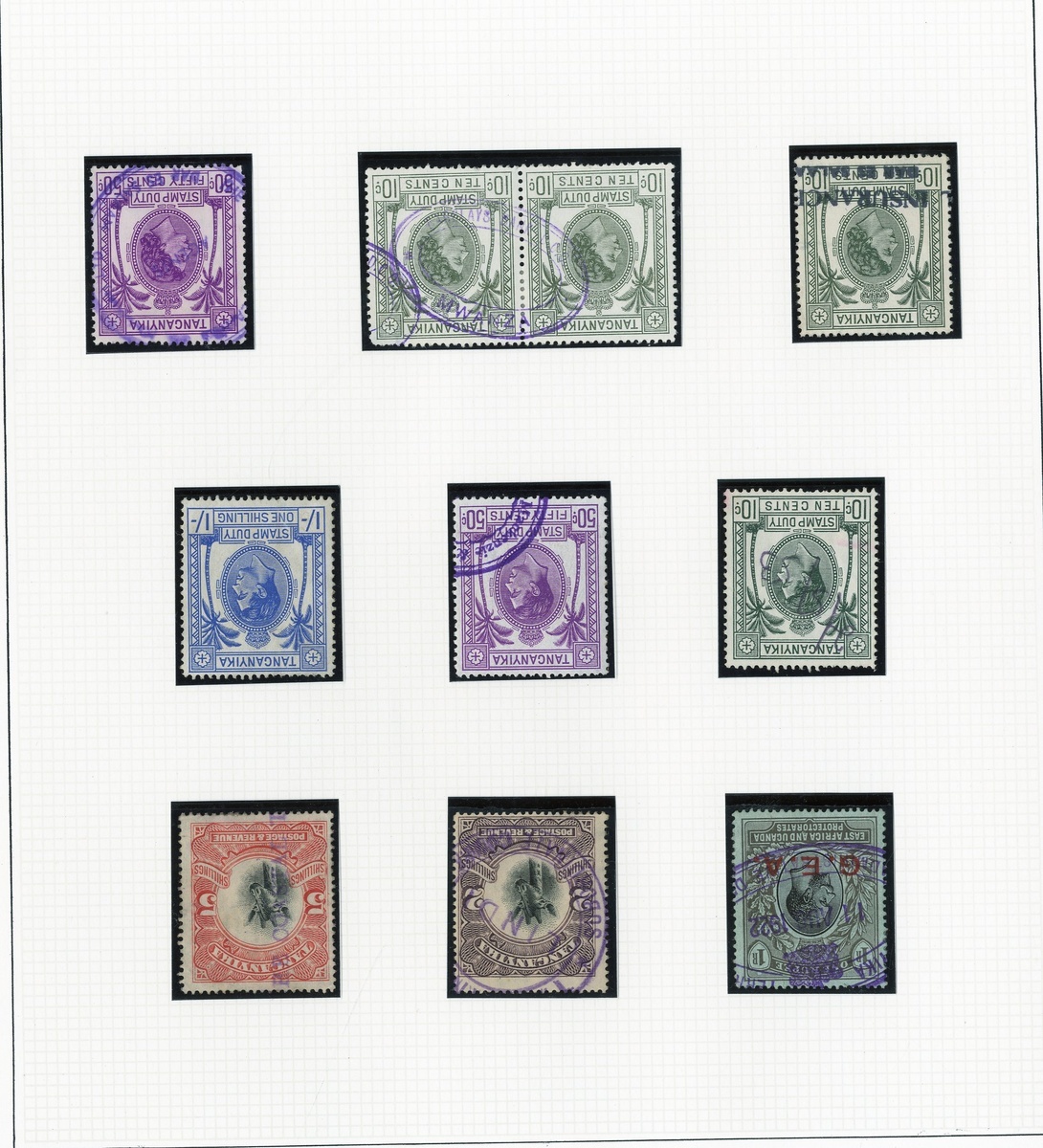 Balance collection on pages and cards with much of interest including Uganda Revenue 1935 10c. black and yellow (5) tied to airmail cover to London, and single values to 5/-, KGVI values to 5/-, QEII to £1, Kenya Revenue 1954 10c. red and 20c. orange and black in marginal blocks of four, and single values to 5/-, Graduated personal tax remainders, opt. "msa/ 02" including imprint blocks of four, Tanganyika including KGVI set to 20/-, with QEII and KGVI 10c. multiples including plate blocks, current number singles and multiples and Kenya impressed revenue 4/- red on complete document. An interesting lot.