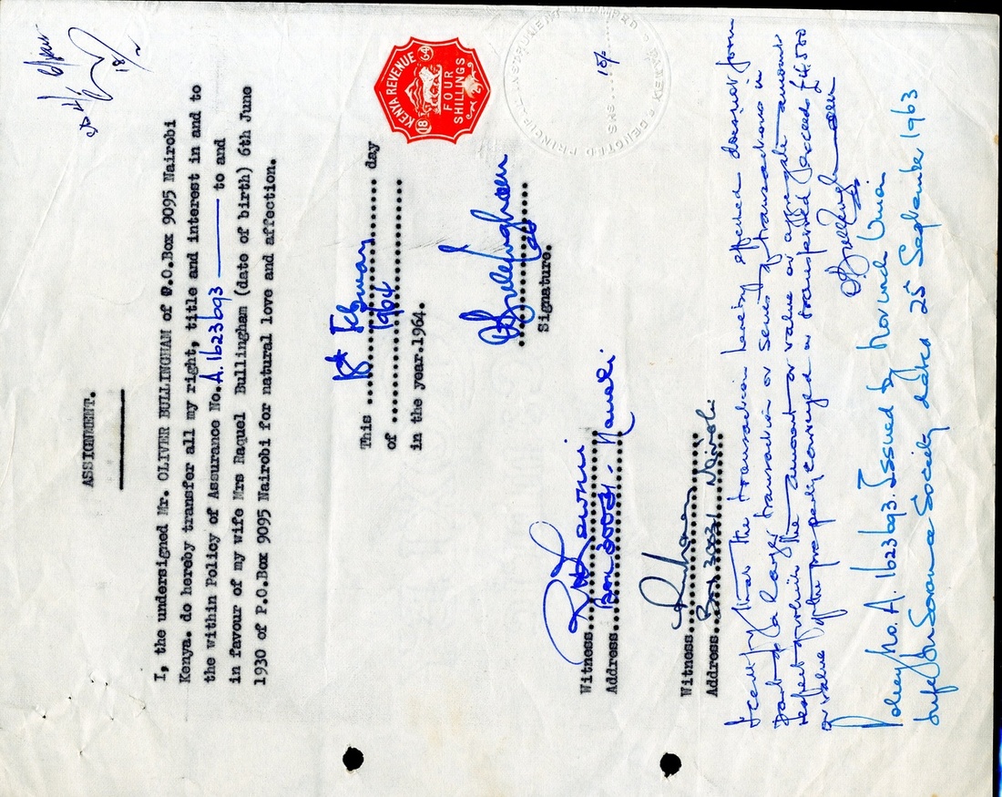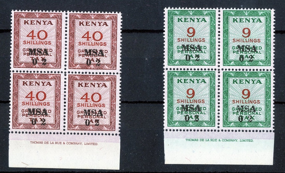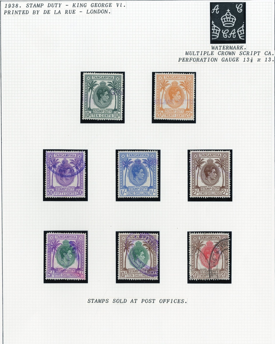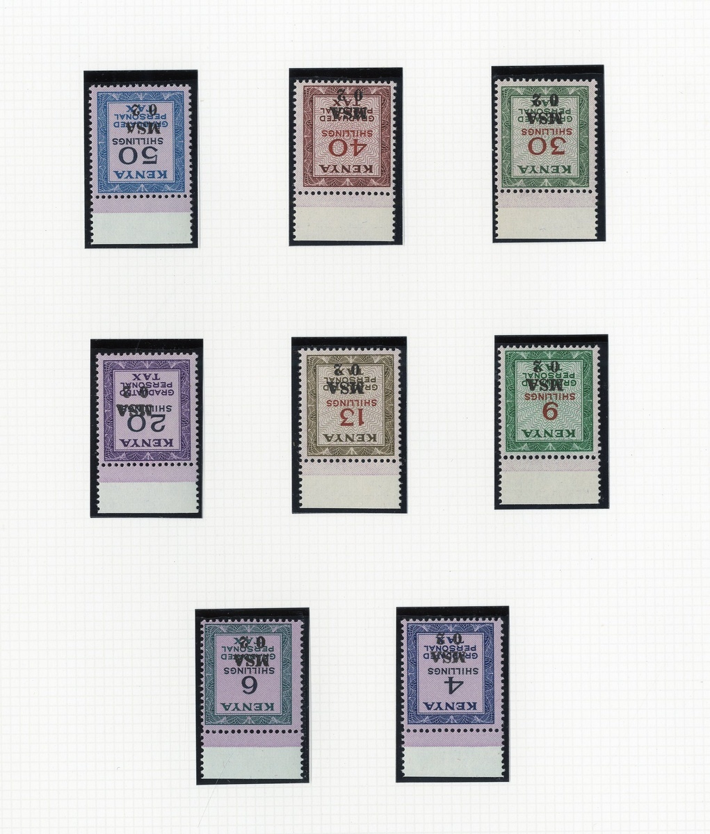 Balance collection on pages and cards with much of interest including Uganda Revenue 1935 10c. black and yellow (5) tied to airmail cover to London, and single values to 5/-, KGVI values to 5/-, QEII to £1, Kenya Revenue 1954 10c. red and 20c. orange and black in marginal blocks of four, and single values to 5/-, Graduated personal tax remainders, opt. "msa/ 02" including imprint blocks of four, Tanganyika including KGVI set to 20/-, with QEII and KGVI 10c. multiples including plate blocks, current number singles and multiples and Kenya impressed revenue 4/- red on complete document. An interesting lot.