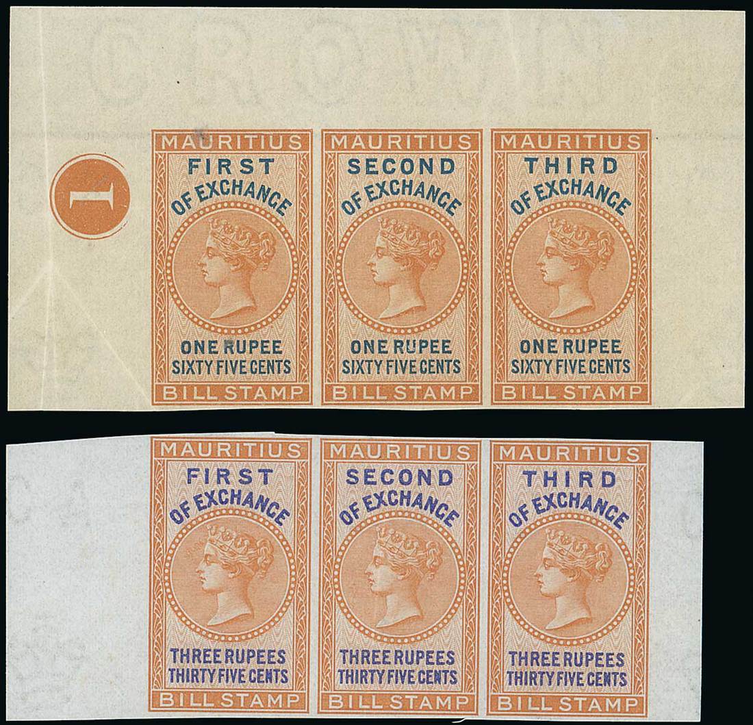 1878 New Currency 1r.65c., 2r.50c., 3r.35c., and 8r.35c., imperforate plate proofs in triplicate on gummed watermarked paper., 1r.65c. value with top and side margins showing plate number 1. Some creasing and 8r.35 with missing lower right corner, nevertheless a scarce and attractive group. Photo
