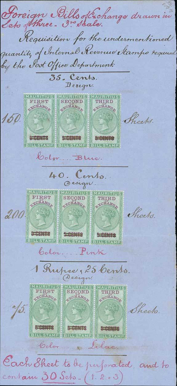 c.1878 Requisition sheet (130 x 280mm) prepared in advance of the 1880 fourth issue bearing 1878 5c. green and purple triplicate strips (3), with each stamp's "5 cents" face value crossed out with manuscript bars, the surrounding annotations indicating the new face value and colour of the new issue, "35 cents/ blue", "40 cents/ pink" and " 1 Rupee + 25 cents/ lilac", all annotations matching the issued colours. Fine and unique. Photo