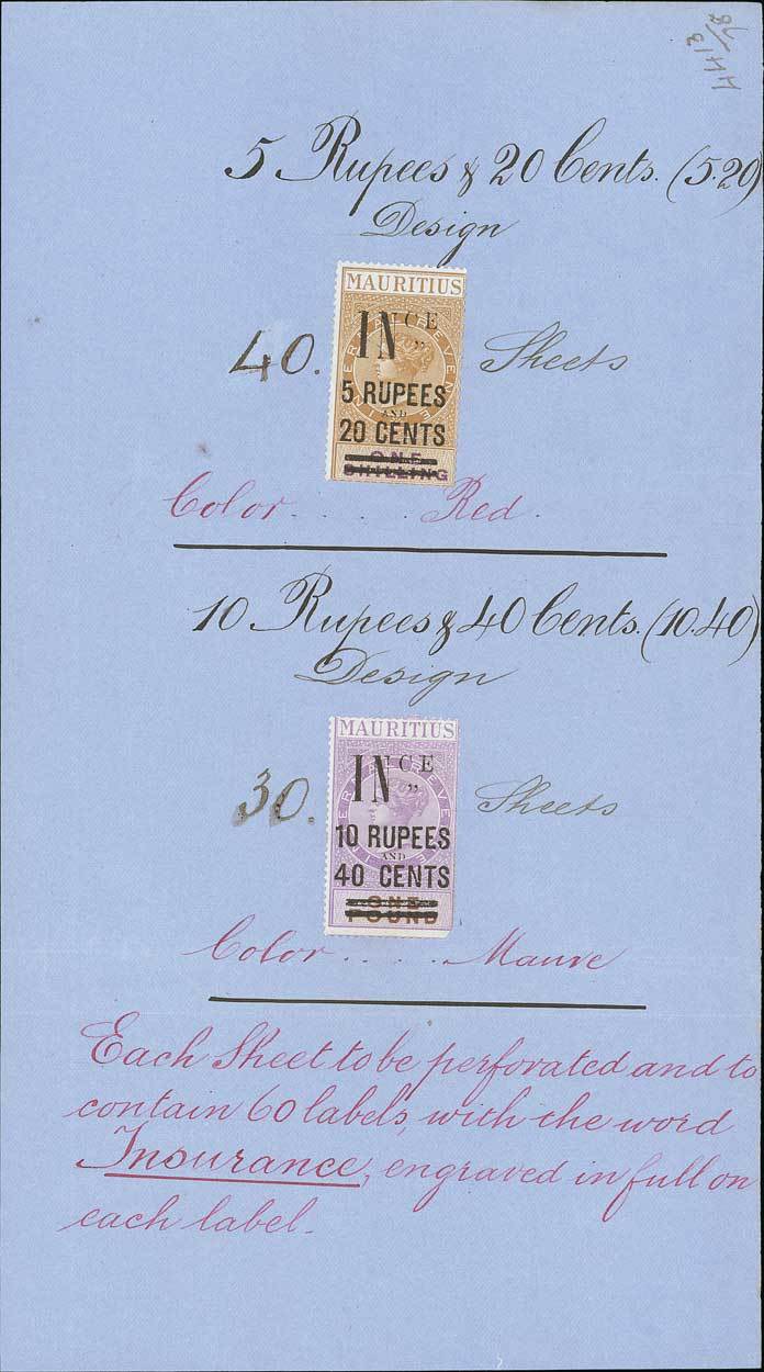 1878 requisition sheets (3, one divided in two for display), produced in advance of the 1879 issue, bearing 1878 overprints (8), annotated with face values and proposed colours (all as issued), with the numbers of each value to be printed, annotated at foot of third sheet "each sheet to be perforated and to contain 60 labels, with the word INSURANCE engraved in full on each label.". Unique and wonderfully sized for display. Photo