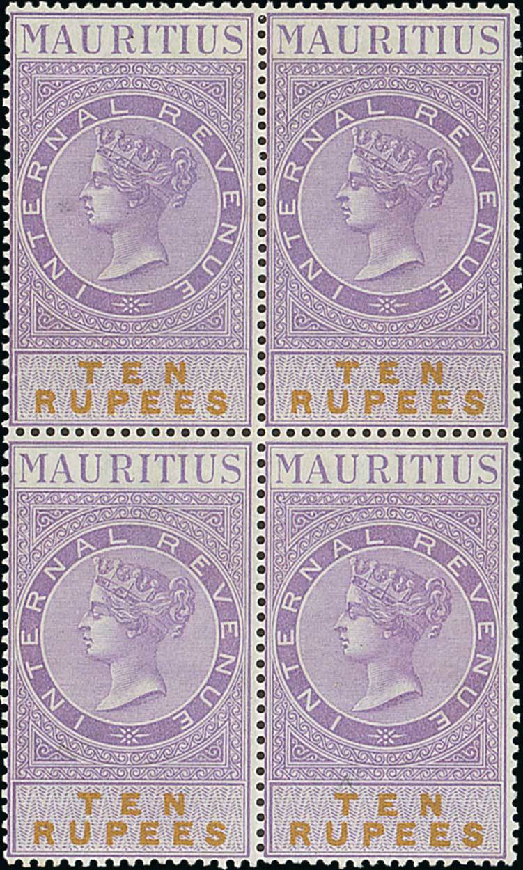 1879 10r. reddish lilac and brown, fine mint block of four with inverted watermark mounted on the top pair only. A remarkable and probably unique survival as a multiple. Photo