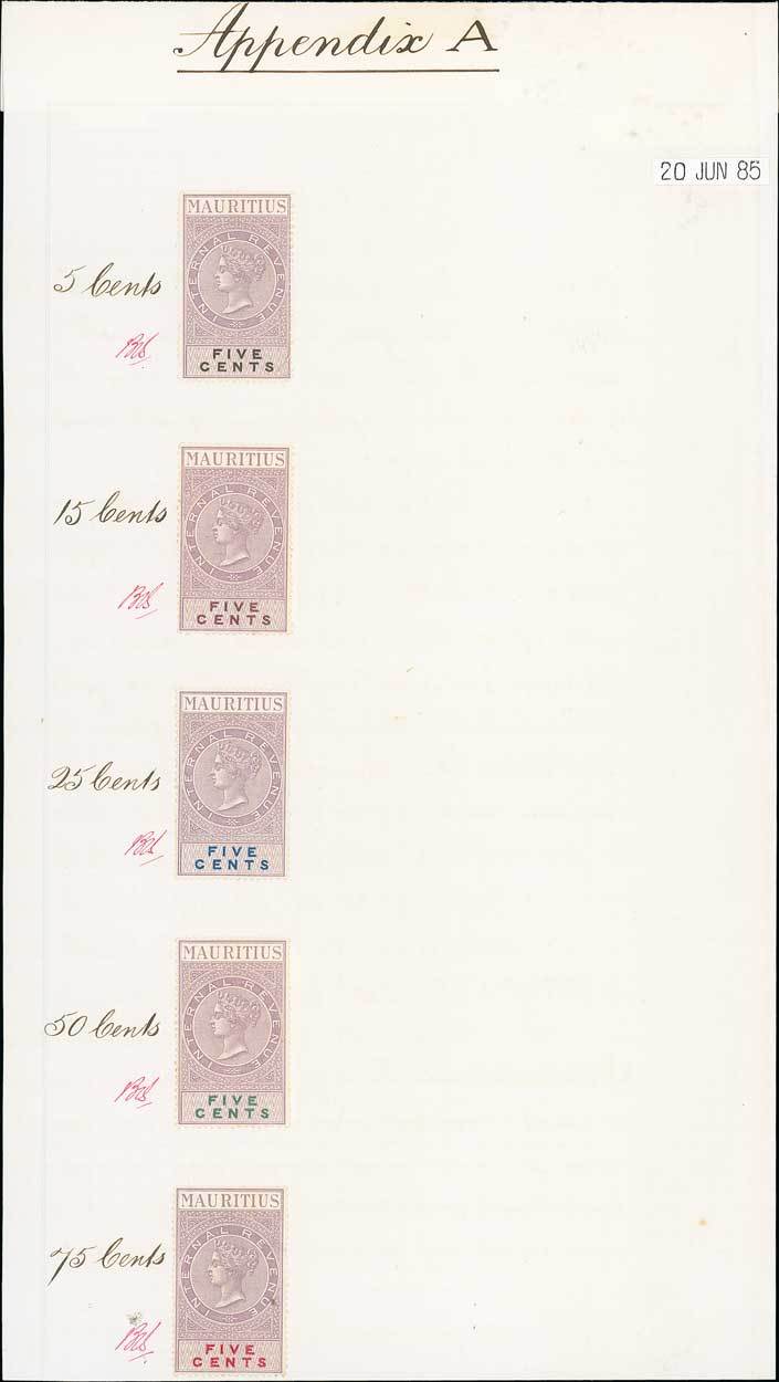 1885 "Appendix A" bearing colour trials (5) denominated 5c., all in fugitive ink (unissued thus), each colour combination annotated with proposed face value and initials. Fine and unique. Photo