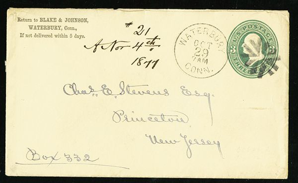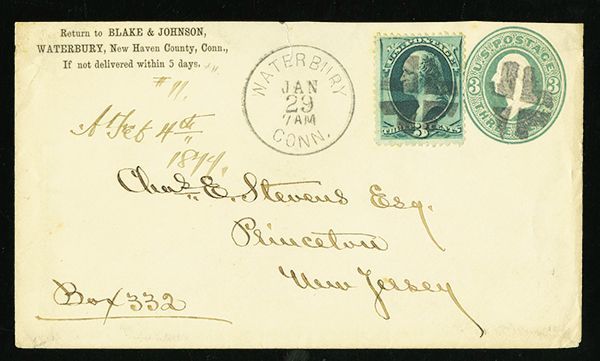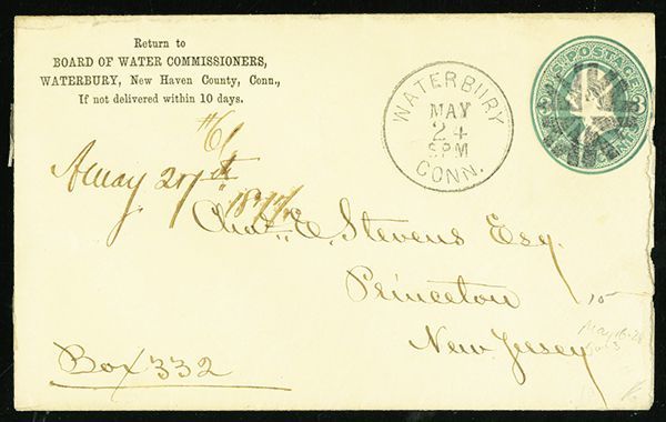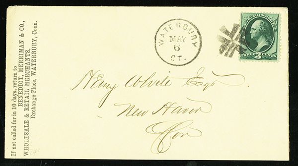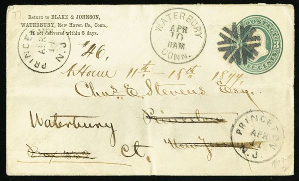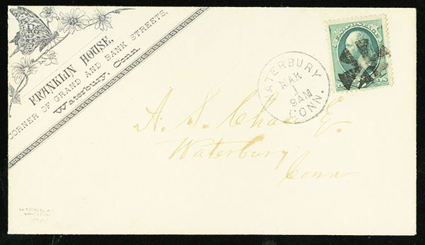 Arrowhead Fancy Cancels group, consisting of Rohloff B-2 on 3c green Bank Note cover to New York, two 1c postal cards with neatly-struck examples of B-3, as well as three on cover, one on 3c Black Official (O49) cover front, B-4 full strike on 3c Green cover to New York, two B-11 on 1c Franklin usages, others on both 3c stationery, and 3c Green cover to New York, B-12 on 3c Green cover to Bridgeport, three B-13 strikes on 1c stationery card, 3c Green postage due cover to Detroit and 3c Green cover to Moline, Illinois, and 3c Green stationery, B-16 on 3c green Bank Note cover to Chester, Connecticut, another on 3c stationery entire to Princeton, New Jersey, superb B-18 on 3c Green stationery front to East Haven, as well as another example on 1c stationery card to Stamford, five B-19 strikes on 1c Black postal cards and 3c stationery entires, one Arrowhead variant on Franklin House Hotel illustrated advertising cover, a few small faults, but an overall lovely group with quality strikes, chiefly fine-very fine.