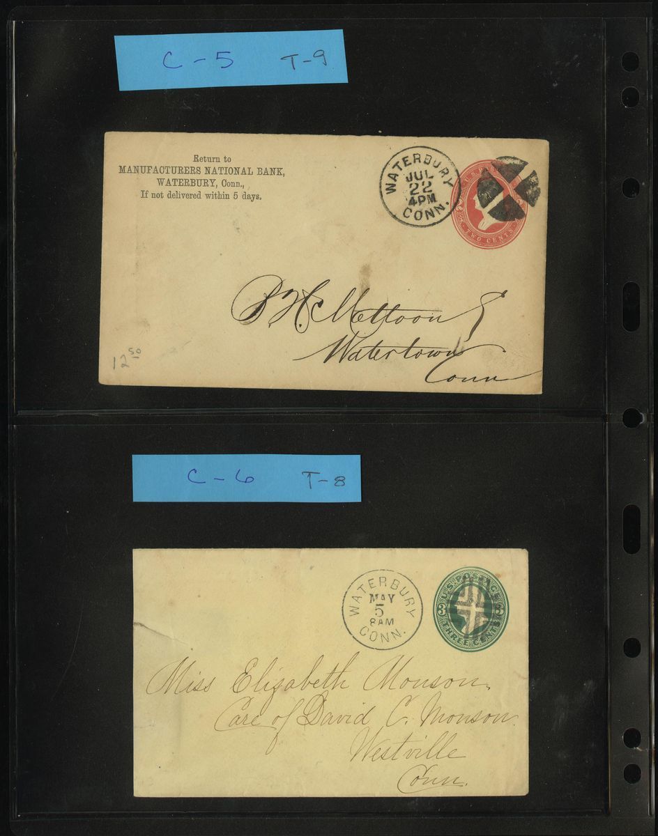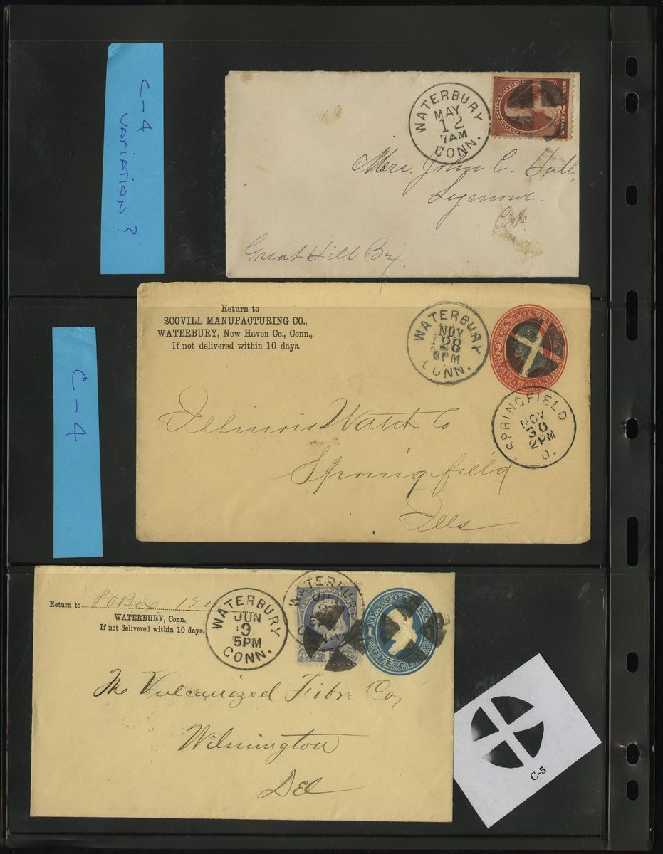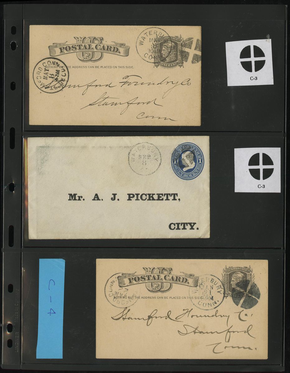 Crossroads Fancy Cancels group of twenty items, most on 3c stationery entires or 1c stationery cards, consisting of C-2 (2), C-3 (3), C-4 (4), C-5 (4), one on uprated 1c stationery cover, another on superb Waterbury Watch Co. illustrated advertising cover, C-6(1), C-7 (2), C-8 (1), and C-9 (2) including on 3c Green pair franked cover to Hartford, a select group chosen for the superior quality of the postmark.