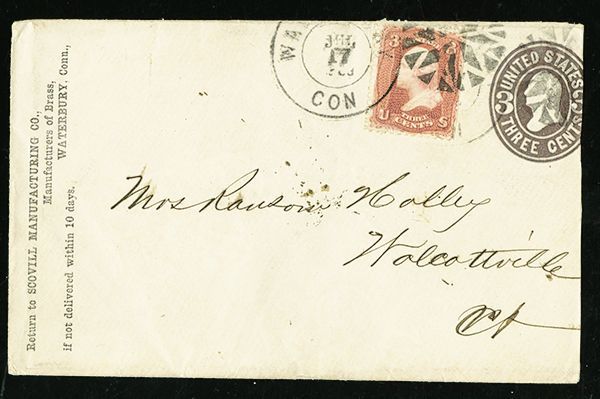Eight Segments Enclosed in Circle of Sixteen Triangles, (Rohloff D-20), two clear strikes, one ties 3c rose (65), to 3c postal stationery entire, to Wolcottville, Connecticut, slightly reduced at right, fine.