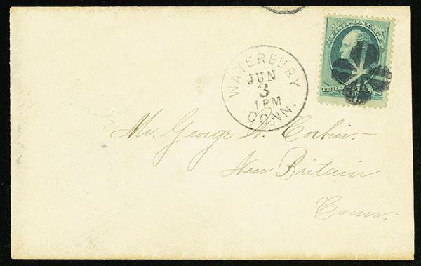 Four-Leaf Clover with Split Petals (Rohloff F-6), exceptional strike on 3c Green cover to New Britain, matching "Waterbury Jun 3 Conn" c.d.s., same-day arrival backstamp, a beautiful example of this scarce cancellation.