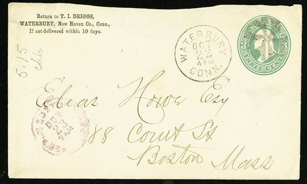 Five White Petals on Black Fancy Background (Rohloff F-7), desirable strike on 1880 3c stationery entire, matching Waterbury c.d.s., to Boston, with violet Oct 23 arrival datestamp, slightly reduced along top and back flap removed, not detracting from this rare postmark, of which Rohloff records fewer than five known examples.