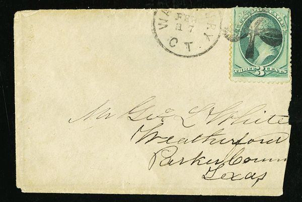 Three-Leaf Shamrock, Type 5 (Rohloff F-12), neat strike ties 3c Green cover to Texas, matching "Waterbury Ct Feb 17" c.d.s., quite likely the first day of use of this particular fancy cancel, reduced at right, perf faults at right and top of stamp, scarce.