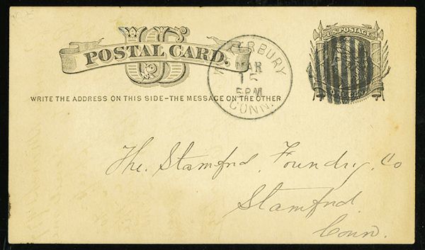 Circular Grid, Type 8 (Rohloff H-8), complete strike on 1c postal card to Stamford, "Waterbury CONN Mar 15" c.d.s., a select example, very fine.