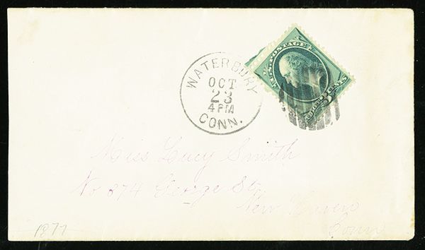 Circular Grid, Type 8A (Rohloff H-8A), bold strikes tie 3c Green (158) to cover to New Haven, Connecticut, "Waterbury CONN Oct 23" c.d.s., a superb and scarce example;