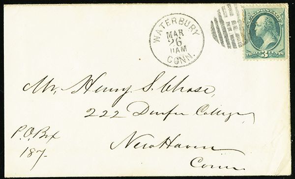 Circular Grid, Type 9 (Rohloff H-9), full strike ties 3c Green (158) to cover to New Haven, Connecticut, matching "Waterbury CONN Mar 26" c.d.s., a few toned perfs at left, a scarce strike, with Rohloff recording no more than eight examples, fine.