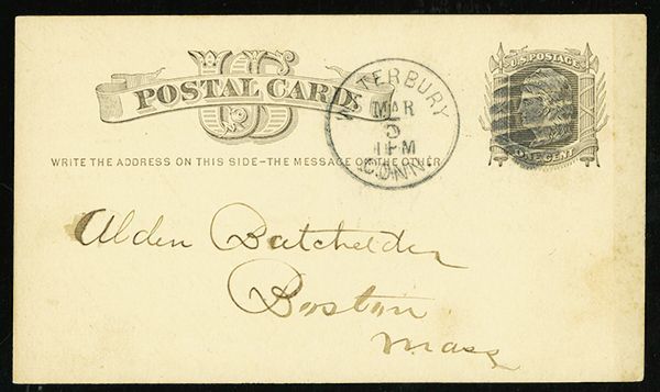 Oval Grid, Type 1 (Rohloff H-10), full strike on 1877 1c postal card to Boston, Massachusetts, matching "Waterbury CONN Mar 5" c.d.s., slight discoloration at right clear of postmark, fine.
