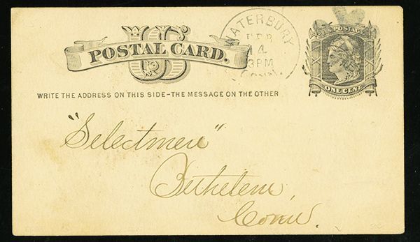 Four Hearts Pointing Inward, Type 2 (Rohloff J-7), superb strike on 1879 1c Black postal stationery card, matching "Waterbury CONN Feb 14" c.d.s., to Bethlehem, Connecticut, an ideal and charming example of this heart design fancy cancel used on Valentine's Day, very fine.