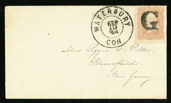 Initial "G", Type 1 (Rohloff K-7), centrally-struck on 3c Rose (65) cover to Bloomfield, New Jersey, bold "Waterbury Con Sep 10 66" double-circle, slightly reduced at right, stamp with perf faults, an ideal and scarce strike, with Rohloff recording no more than eight examples, fine.