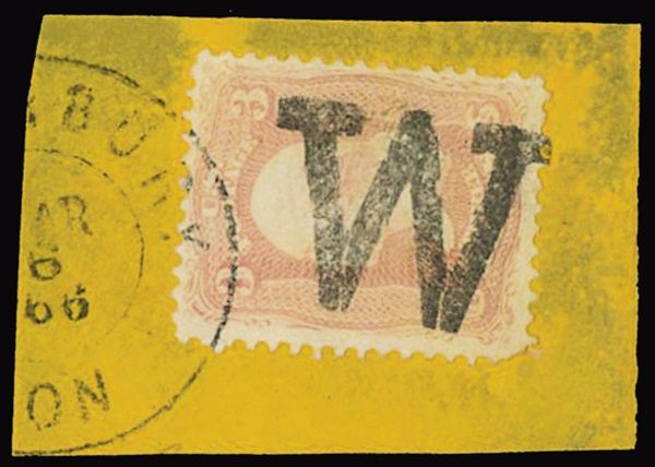Initial "W" with Serifs at Top, Type 2 (Rohloff K-15), complete strike ties 3c Rose to orange piece, further tied by partial "Waterbury Con 1866" c.d.s., some discoloration to piece, stamp and strike remarkably fresh, fine.