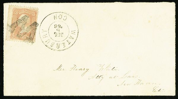 Initial "W," with Serifs at Top, Type 4 (Rohloff K-17), complete strike ties 3c Rose to cover to New Haven, Connecticut, neatly-struck "Waterbury Con Jul 6 66" double-circle, stamp lightly soiled, a choice strike, very fine.