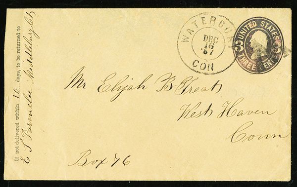 Initial "W", with Serifs at Top, Type 5 (Rohloff K-18), neat strike on 3c Pink stationery entire (U59, oxidized), to West Haven, Connecticut, matching "Waterbury Con. Dec 16 1867" double-circle, slightly reduced at left, scarce and fine; ex Houser, with 1990 P.F. certificate.