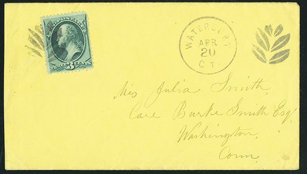 Six-Petaled Leaf, Type 1 (Rohloff L-13), clear strike ties 3c Green (158), additional free strike at right, on cover to Washington, Connecticut, "Waterbury Ct. Apr 20" circular datestamp, a lovely example, very fine;