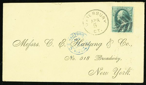 Stylized Leaf, Eight Segments, Type 3 (Rohloff L-27), bold strike on 3c Green (158) on buff cover, matching "Waterbury Ct. Apr 5" circular datestamp, to New York, very fine.
