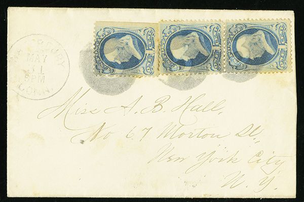Negative "5" in Circle (Rohloff N-2), three strikes tie 1c Ultramarine (134) pair and single on 1880 cover to New York City, matching "Waterbury Conn May 31" c.d.s., some perf toning, slightly reduced at right, an unusual franking, fine.