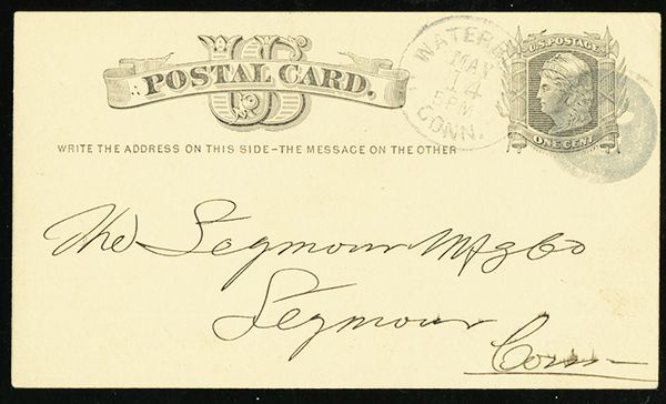 Negative "5" in Circle (Rohloff N-2), neatly-struck on 1c Black postal card (UX5), matching "Waterbury Conn May 14" c.d.s., to Seymour, Connecticut, very fine; ex-Houser, with 1990 P.F. certificate.