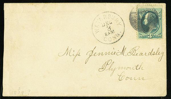Negative "7" in Circle (Rohloff N-3), neat strike ties 3c Green (158) on buff cover to Plymouth, Connecticut, matching "Waterbury Conn Dec 3" c.d.s., very fine;